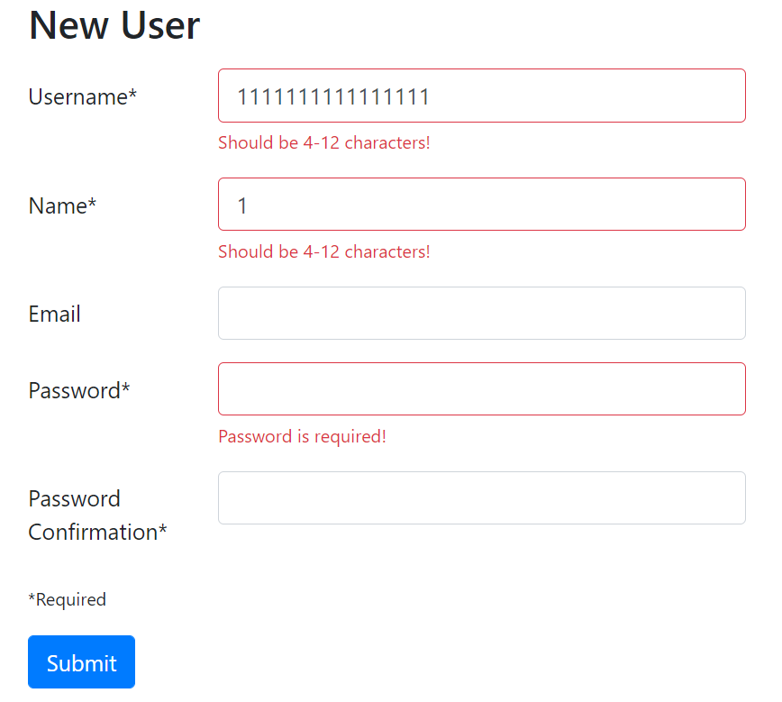 에러가 있으면 bootstrap의 invalid-feedback class를 사용한다. 서버 측에서 유효성 검사를 사용한 것이다.