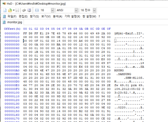 맨 앞에 FF D8 FF E1 은 JPEG파일의 헤더 시그니처이다.