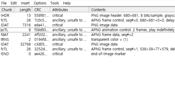아까 이 PNG 파일의 청크들 중 APNG와 관련된 fcTL, fdAT 청크들이 있었다. 그래서 이 파일은 결국 PNG파일이 아닌 APNG파일인 것이다.