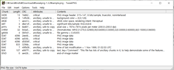 tweakpng 프로그램과 함께 다운로드 된 sample.png를 프로그램으로 열어보았다.