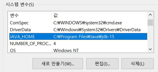 우선 시스템 변수에 새로 만들기를 클릭해 변수명이 JAVA_HOME 이고, 값은 아까 복사한 주소를 붙여넣기한다.