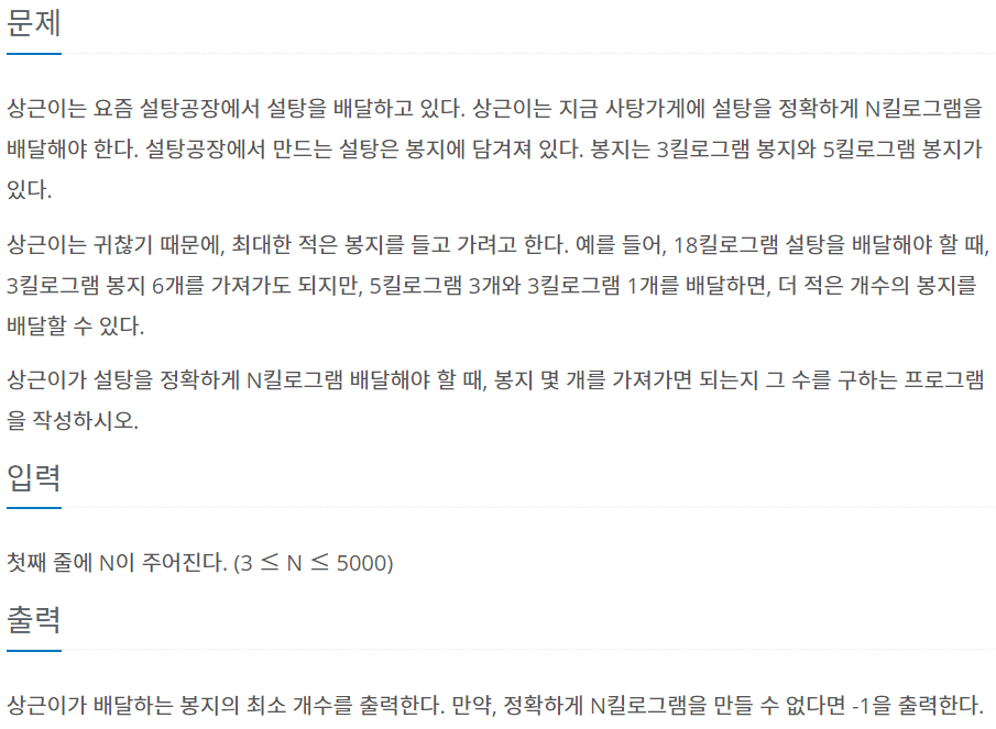1st. 무게에서 5를 뺀다(봉지개수를 최소화 한다고 하였으므로) -> 봉지개수 +1