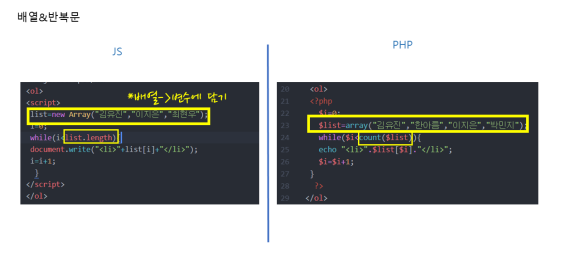·반복문으로는 while문을 사용하였어요. 배열요소가 모두 출력될 때까지 실행되도록 조건문으로 i< list.length (js), $i<count($list) (php) 을 넣었어요. 만약에 i가 배열의 길이랑 같거나 커진다면, 조건문의 결과는 false이므로 반복문이 종료됩니다.