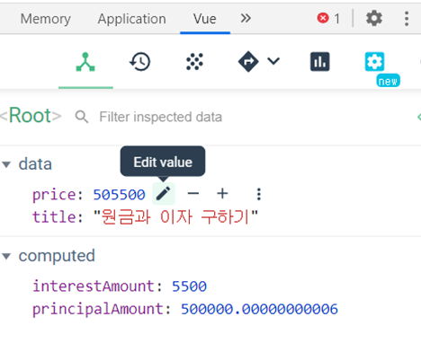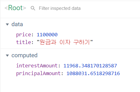 뷰 인스턴스의 data 객체와 computed 프로퍼티에 대한 정보가 나타난다.