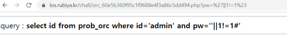 1!=1은 거짓이므로 query문은 거짓이 되어 문구가 출력되지 않는다.(앞의 id='admin' and pw='' 는 pw값이 없으므로 당연히 거짓 !)