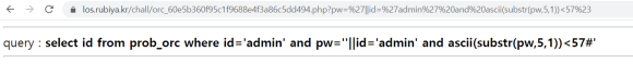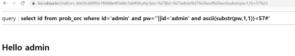 id='admin' and ascii(substr(pw,1,1)) < 57 (57은 9이다) 부터