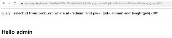 1=1이 참이므로 query문이 참이 되어 Hello admin 문구가 출력된다.