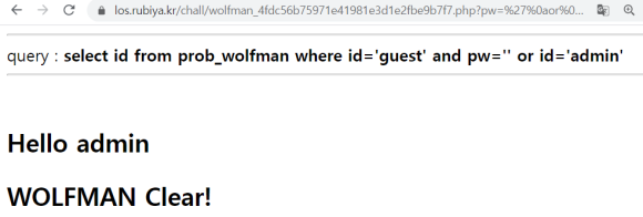 pw와 무관하게 id가 admin 일 때 문제가 풀리는 것을 확인 할 수 있다.
