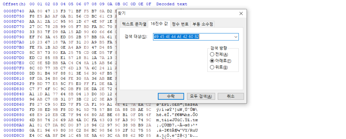 png 파일의 푸처 시그니처인 49 45 4E 44 AE 42 60 82 를 검색해보면