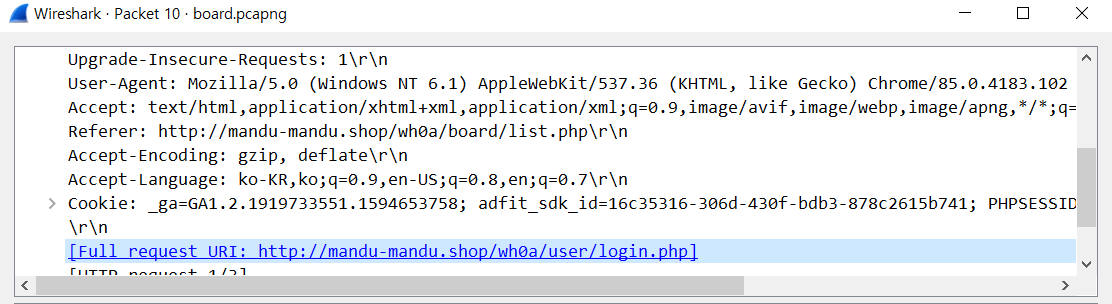 여러 패킷들 중 GET 요청을 받는 http 프로토콜을 클릭해 확인해보니