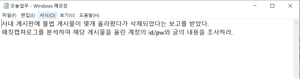 먼저, 텍스트 파일을 열어보면 불법 게시물을 올린 계정의 id와 pw, 글의 내용을 조사하라고 한다.