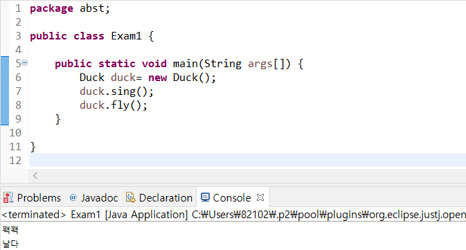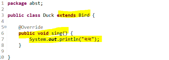 그리고 추상클래스 Bird를 상속하는 Duck 클래스를 생성한다.