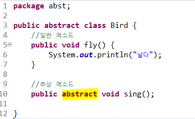 일반 메소드 fly와 추상 메소드 sing을 선언한다.