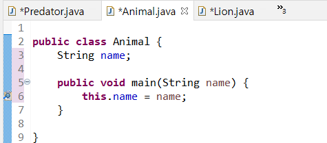 우선 Animal 클래스를 생성하였다. 앞으로 생성할 육식동물 클래스들(Predator인터페이스를 implements함)의 부모클래스이다.