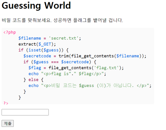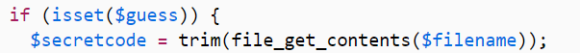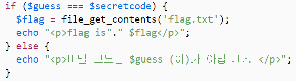 secret.txt를 file_get_contents함수를 통해 문자열로 읽어주어 이를 변수 secretcode로 정의한다.