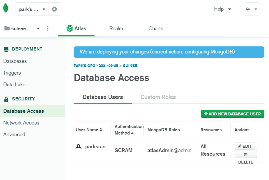아까 환경변수에 넣은 connection string에 myfirstDatabase 부분을 database명으로 수정하여 입력했어야 했던 것이다.
