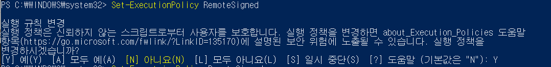 그리고나서 Set-ExecutuionPolicy RemoteSigned를 입력하고