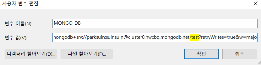 환경변수에 connetion string을 MONGO_DB라는 이름으로 저장하였다.